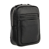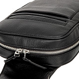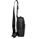 Стильная чёрная сумка-слинг с лямкой через плечо, выполнена из натуральной кожи. Закрывается на двустороннюю молнию. Внутри одно вместительное отделение. Снаружи на лицевой стороне два кармана для мелких предметов. На лямке карман на молнии.